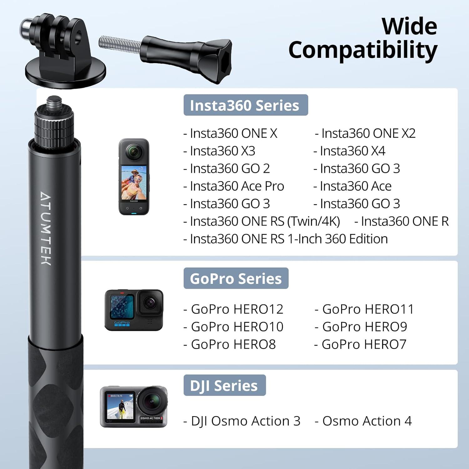 ATUMTEK 60″ Invisible Selfie Stick, 1/4″ Extendable Monopod Pole, Solid and Compact Design for Insta360, for GoPro, DJI, Action Cameras (Buckle Mount for GoPro & DJI and Wrist Strap Included)(114cm)