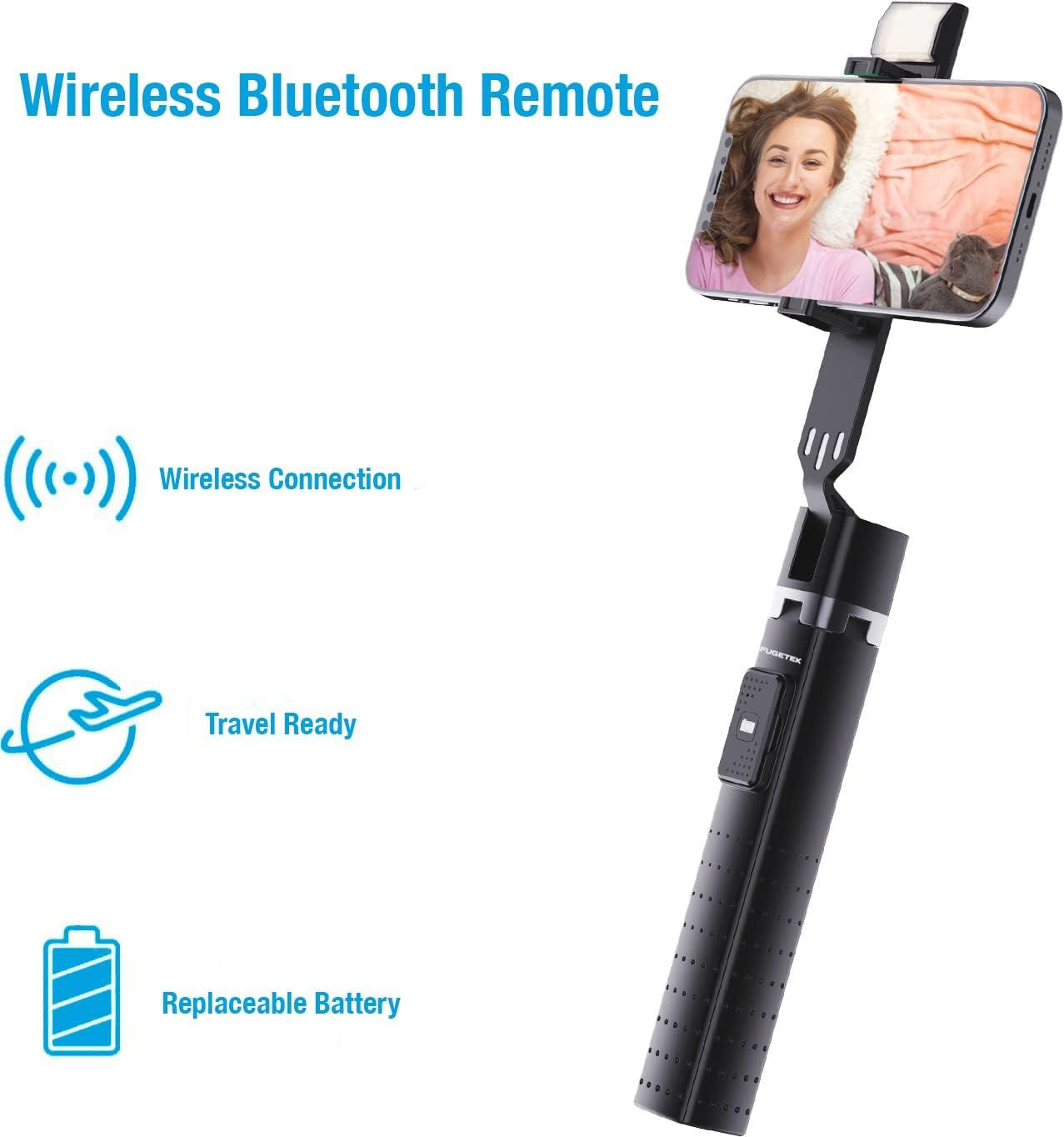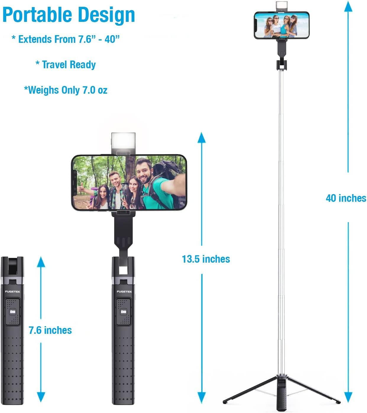 Fugetek 40” Quadrapod Lighted Selfie Stick Stand, Lightweight 7oz, Wireless Bluetooth Remote, Patented Ultra Stable 4 Legs, 3 Onboard Light Modes, Compatible with iPhone & Android (Black)(Black)